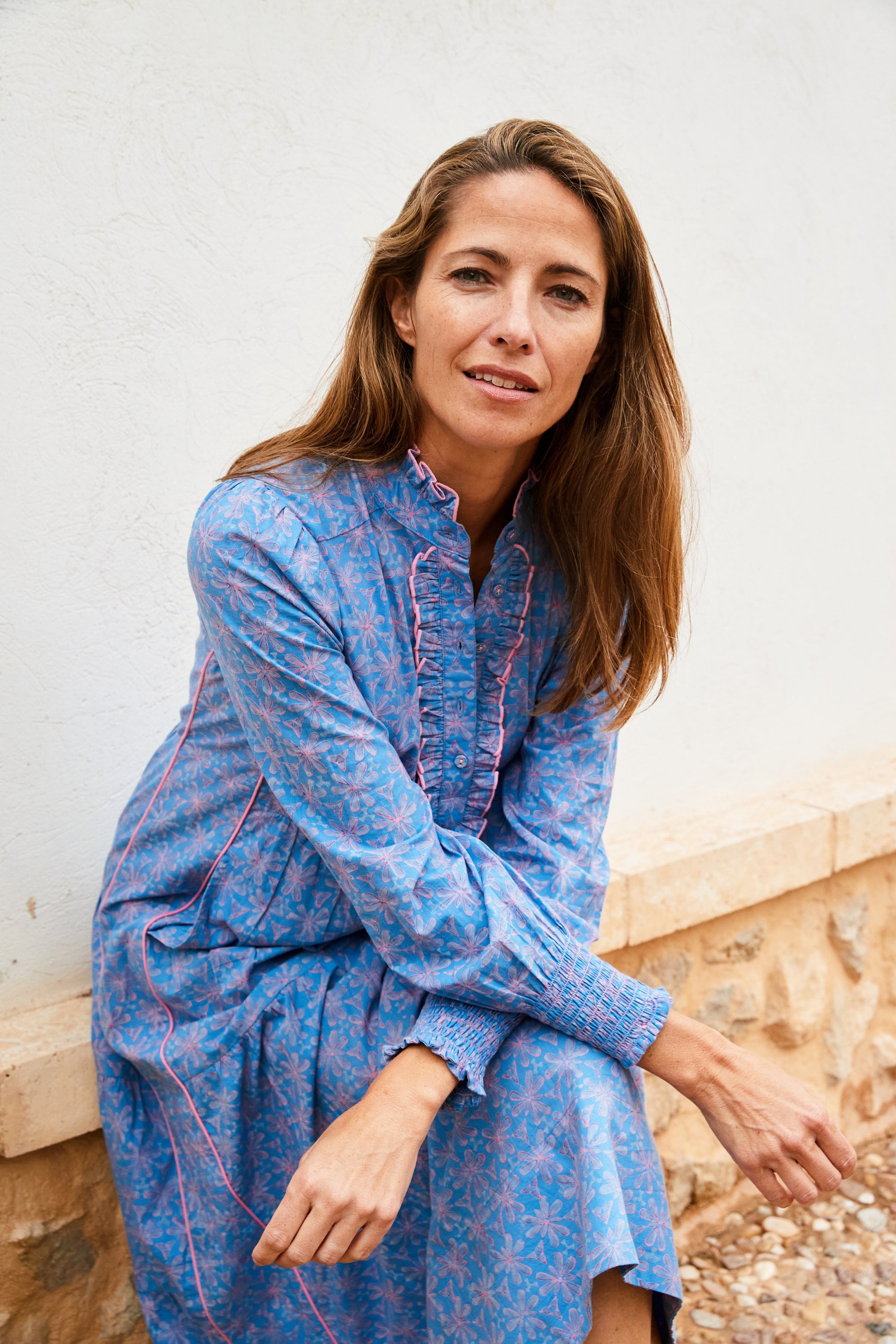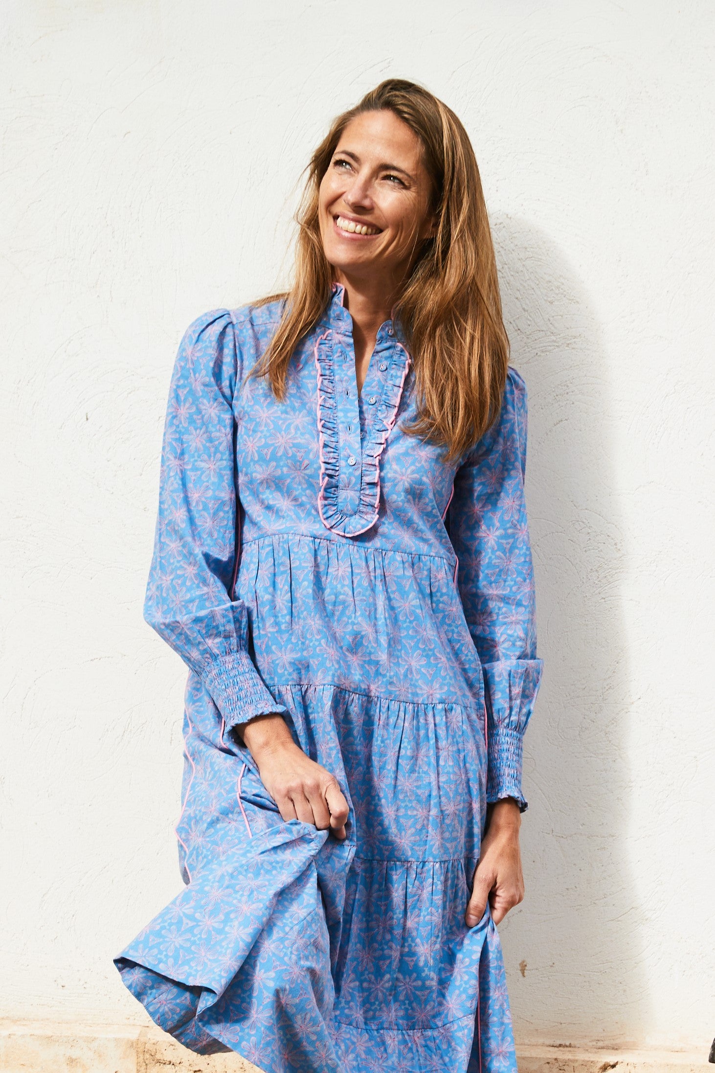 In a stunning blue with soft pink flowers and gorgeous pink detailing, here is a new Deborah dress to help you with your Spring wardrobe. The Deborah dresses are one of our most popular and flattering shapes. Fitted on the top with lovely puff sleeves and gently skimming over the hips from below the bust. Of course the dress has pockets!! The model is 5'7'' and wears a UK 8- We advise sizing down in this style if you have narrower shoulders or stay true to size if broader shouldered.