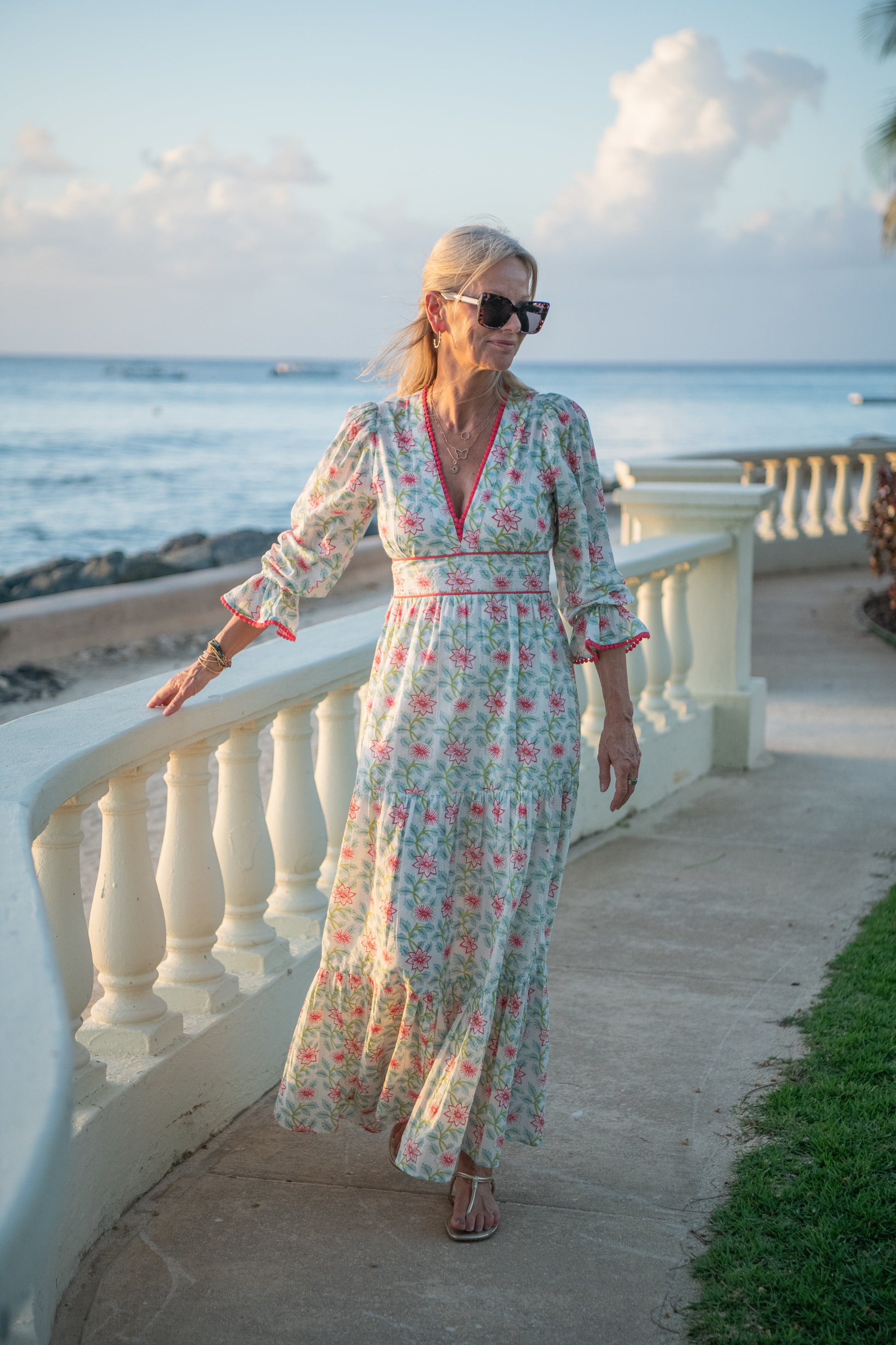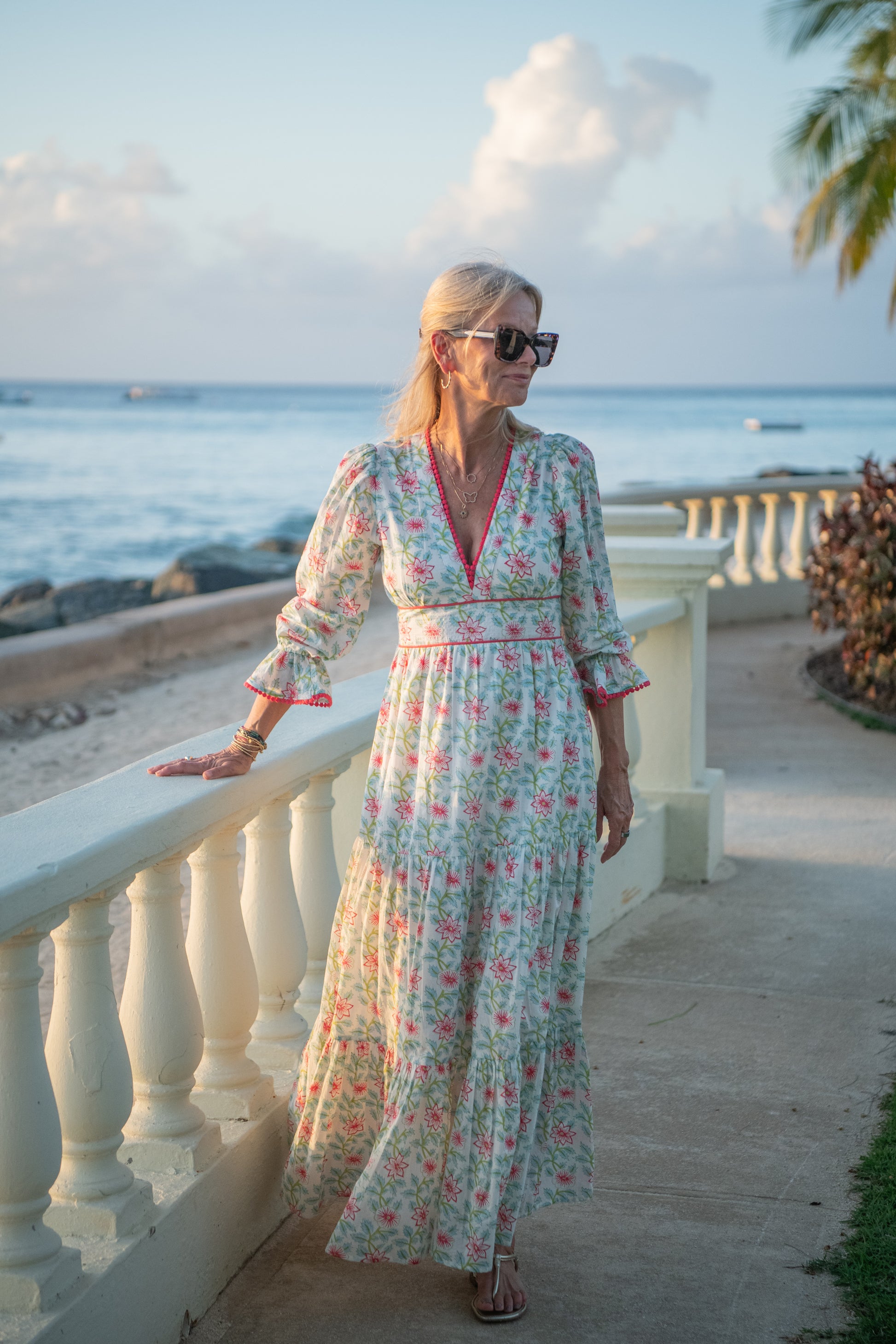 The new floral vine fabric is difficult to describe, with luminous pink flowers and soft green and blue leaves, it’s lovely and fresh. The bobble lace detailing is an unusual shade of pinky red. This hugely flattering shape is popular in all sizes and lots of different body shapes. Fully lined to the knees, the dress fastens with a discreet side zip and floats beautifully with every step, making it perfect for many occasions, from wedding guest to beach lunches, sunny weekends, or simply adding a touch of effortless fun to your day. Feminine, flirty, and full of movement – the Eliza is made for twirling! We often put a little stitch on the lower neckline bobbles if we feel it is too low.