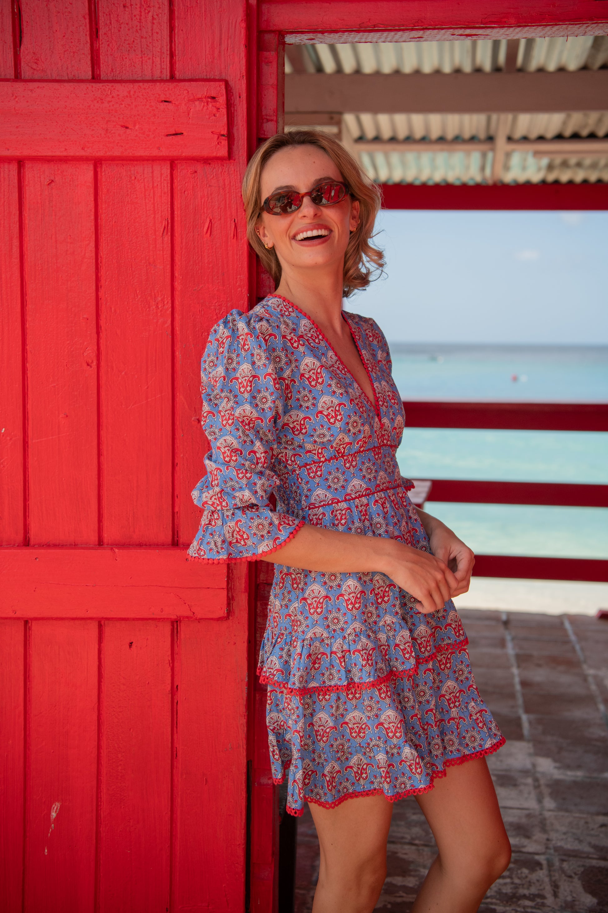 Our mini Eliza is a flirty, fully lined summer staple, perfect for holidays, festivals or parties. Set on a strong blue background with playful red and white lotus flowers, it has red detailing on the cuffs, neckline, waist and tiers for a vibrant, feminine touch. Made from soft cotton, it has a structured under-bust band at the front with shirring across the back and a discreet side zip for a comfortable, flattering fit. Exaggerated puff sleeves and delicate lace trim complete this romantic, playful silhouette.