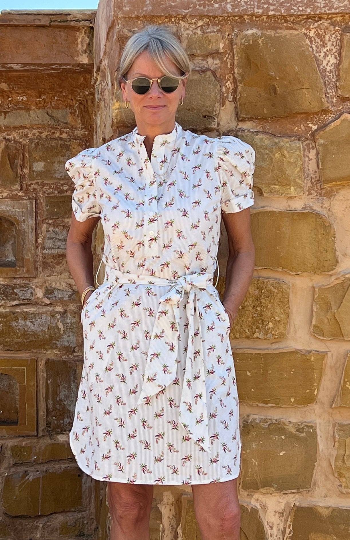Our new Missy shirt dress is simple and elegant with our signature beautiful detailing. Something for those who don’t want long but just as flattering as our other styles whether worn loose or cinched with the wide fabric belt. It has a little upstanding collar, part button placket and gorgeous fold detailing on the puff sleeves, of course pockets and a shirt hem. This is Summer personified an easy pop on classic dress. It can be worn with or without the belt and in this poplin fabric it feels lovely and crisp and perfect for a sunny day.