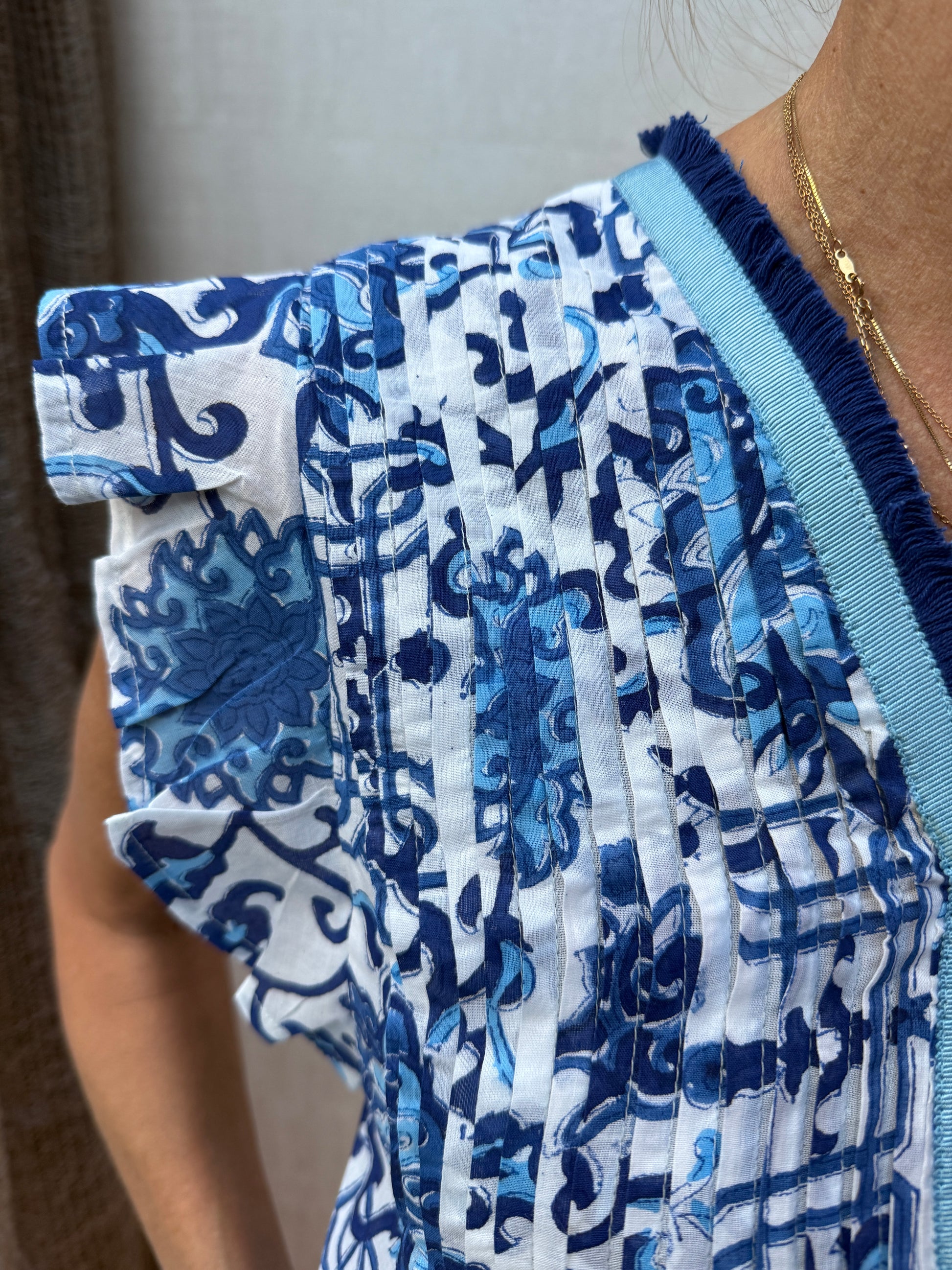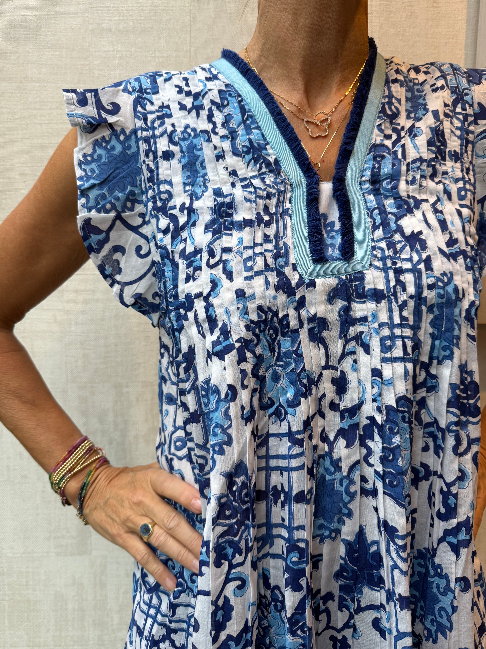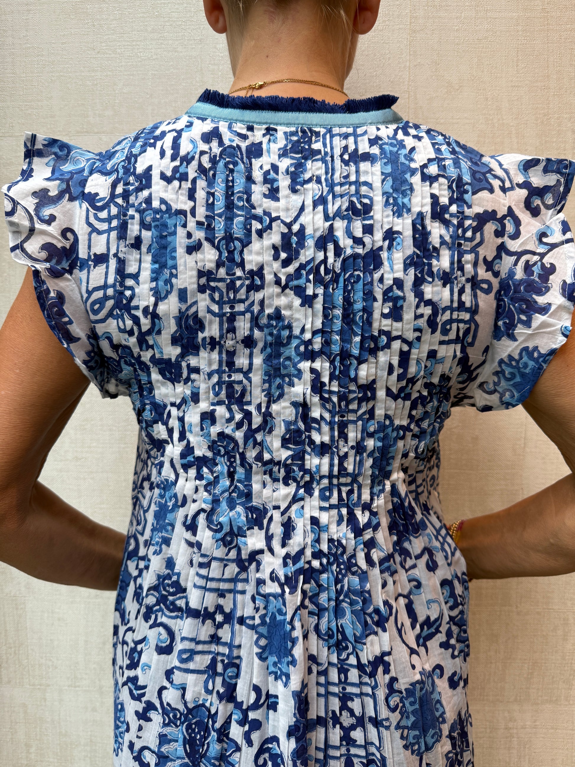The essential beach/pool pop-over you will never want to take off! In a generous A-shape with lots of pretty pleats on both front and back it is light as a feather and ideal for just pulling on when you are wearing a costume. The beautiful cotton voile just floats around you when you walk and makes it lovely to wear on a hot day. A must have in your holiday wardrobe.