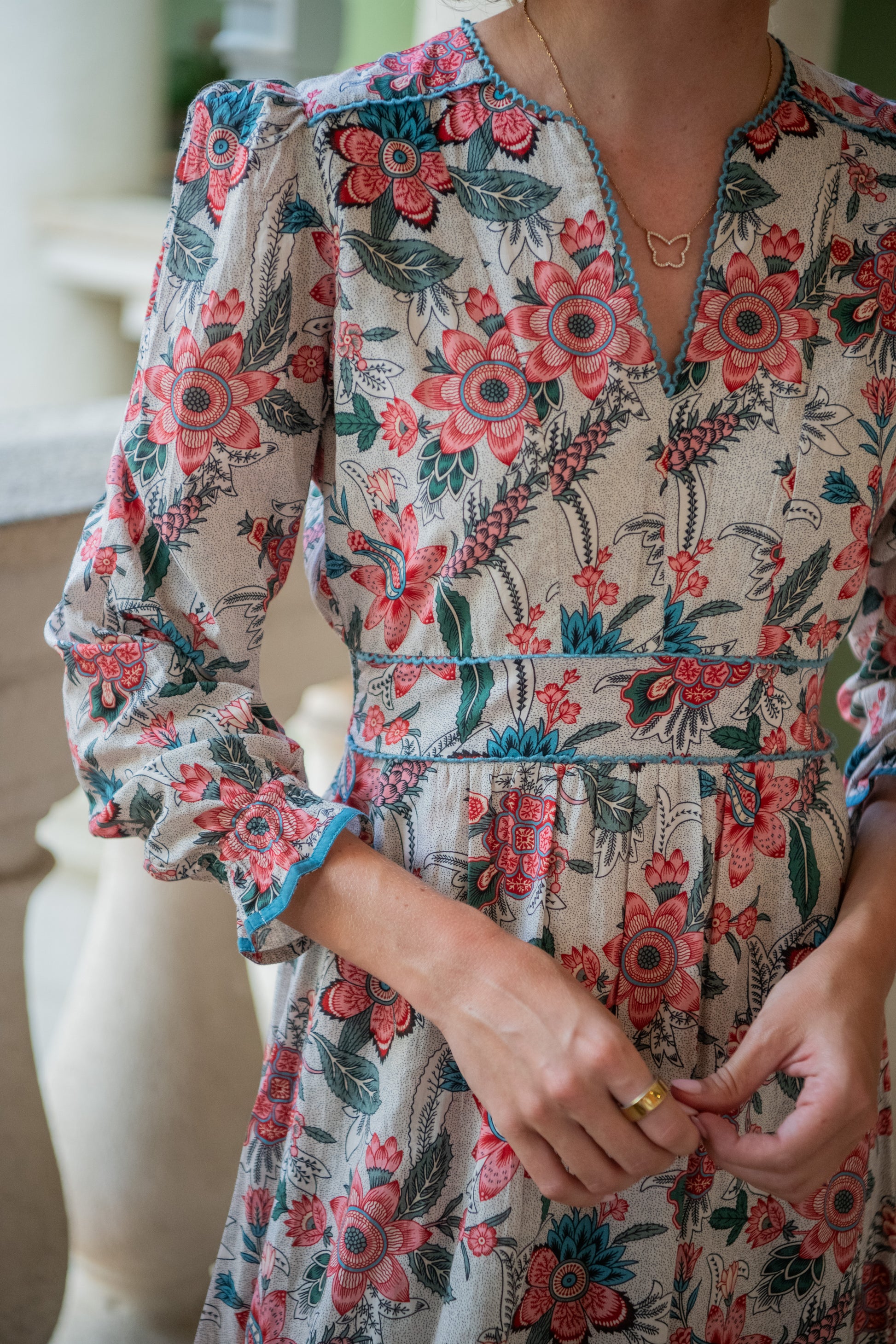 Introducing the Olivia dress - a brand-new style at Lexy London, created in response to everything you have been asking for! Set on a soft cream base with tiny dots and delicate pink and blue florals, it features long sleeves, lightly elasticated on the cuff which can be pulled up to wherever you prefer to have your sleeves. The dress is a midi dress which finishes with a charming bottom frill. The waist is front fixed with a shirred back for comfort. Teal blue lace trims the neckline, shoulders and waist, adding a subtle, elegant pop of colour. Fully lined to the knee for comfort, this dress slips on effortlessly over the head, offering a relaxed yet feminine silhouette that’s perfect for sunny weekends.