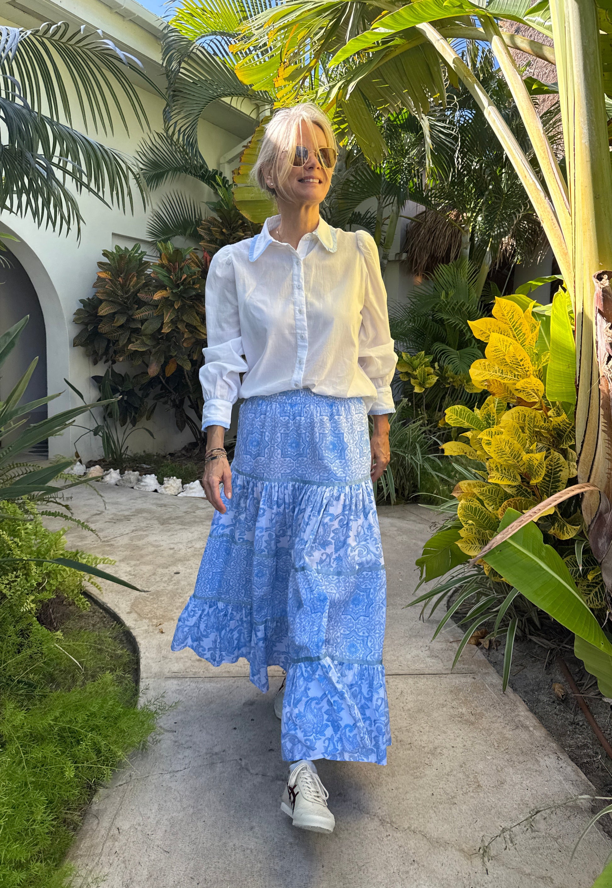 The Saskia skirt is a much-loved staple in our collection, designed for effortless, everyday wear. With a softly elasticated waist and practical pockets, it offers comfort without compromising on style. Made from two beautifully patterned blue fabrics, the tiers alternate to create movement and interest, each finished with delicate grosgrain ribbon detailing. A true standout piece, it’s perfect to take on holiday with a simple tee or blouse, and just as easy to style with a cardigan and trainers as the seasons change. This skirt is half lined.