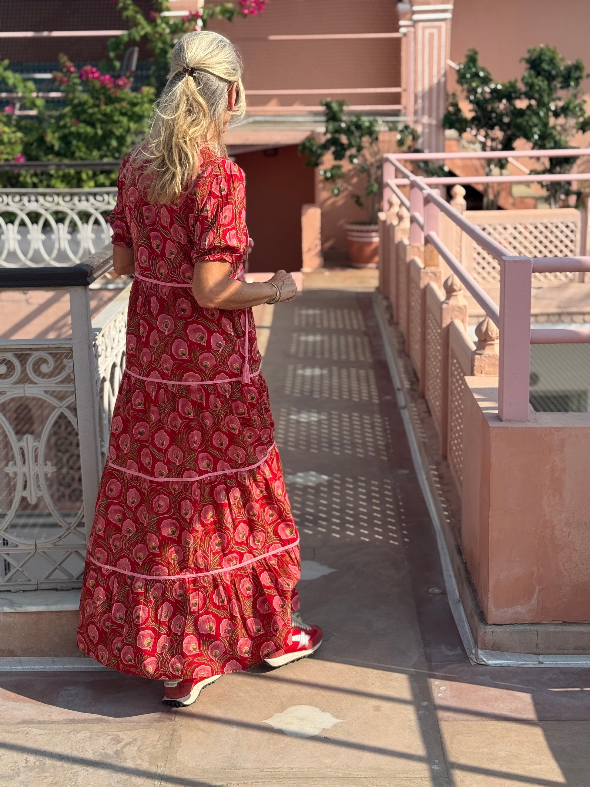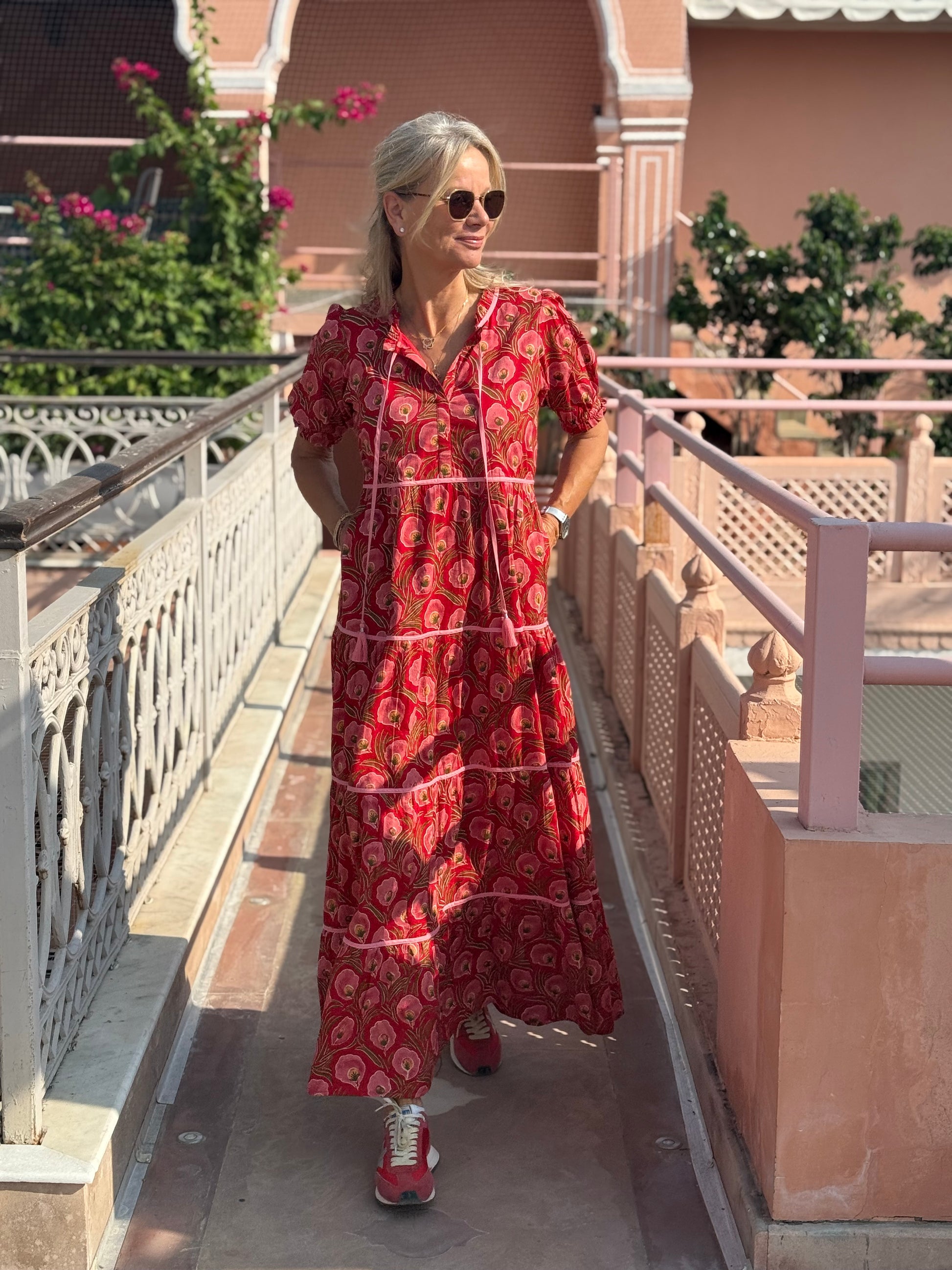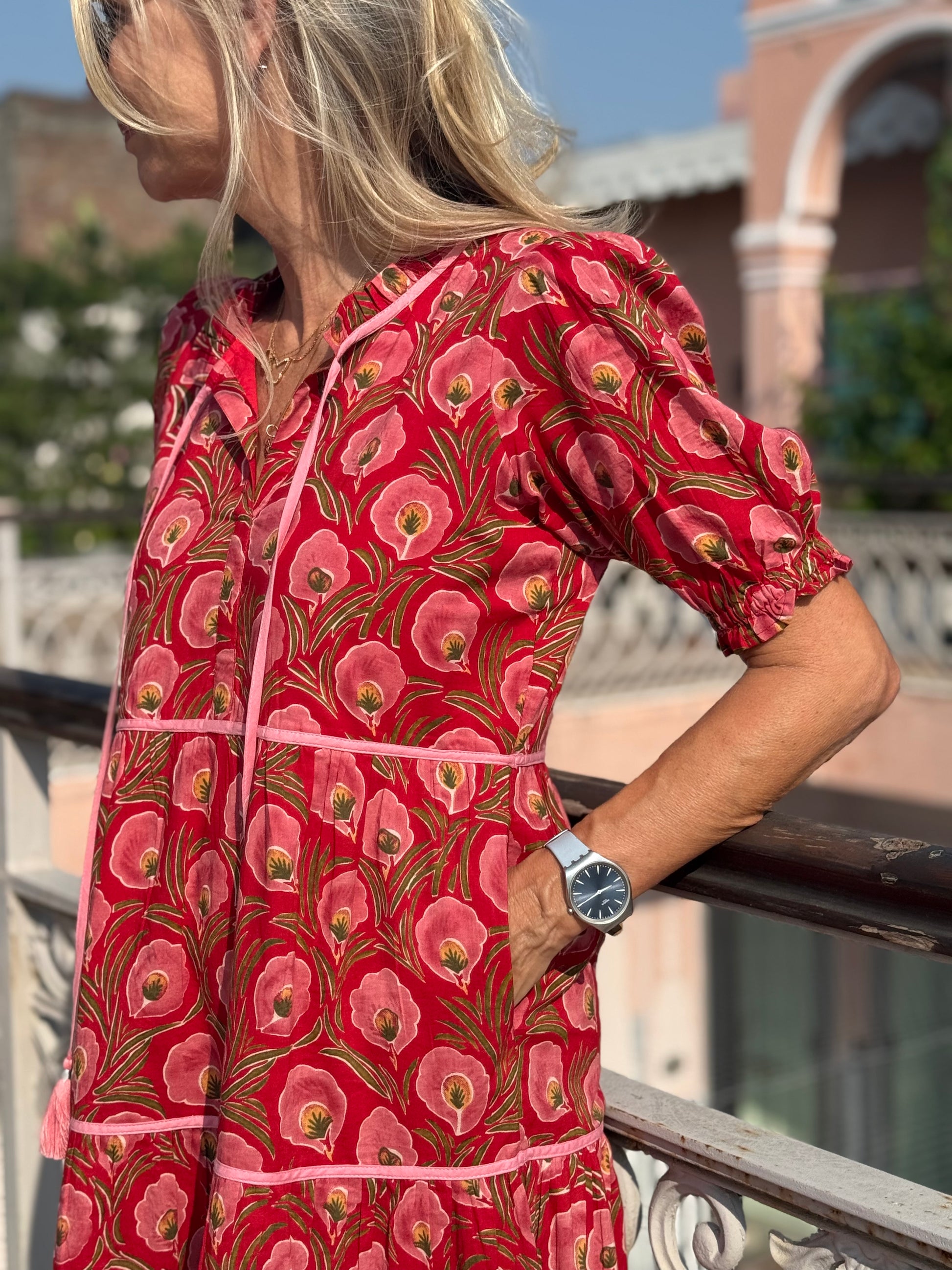 A firm favourite of the Lexy London team, the Tasha is the easiest shape dress to wear! It is slim over the bust and then flares out gently below, into a long, loose silhouette. The dress has pockets and a pretty tassel on the neck ties. This is such a lovely dress to wear any time of day or evening, quickly dressed up with some sandals and jewellery or trainers for the day. The most comfortable dress you will ever add to your wardrobe. In this strong daisy colour way you can wear it really early spring with a jacket or take it away on holiday without needing a tan!
