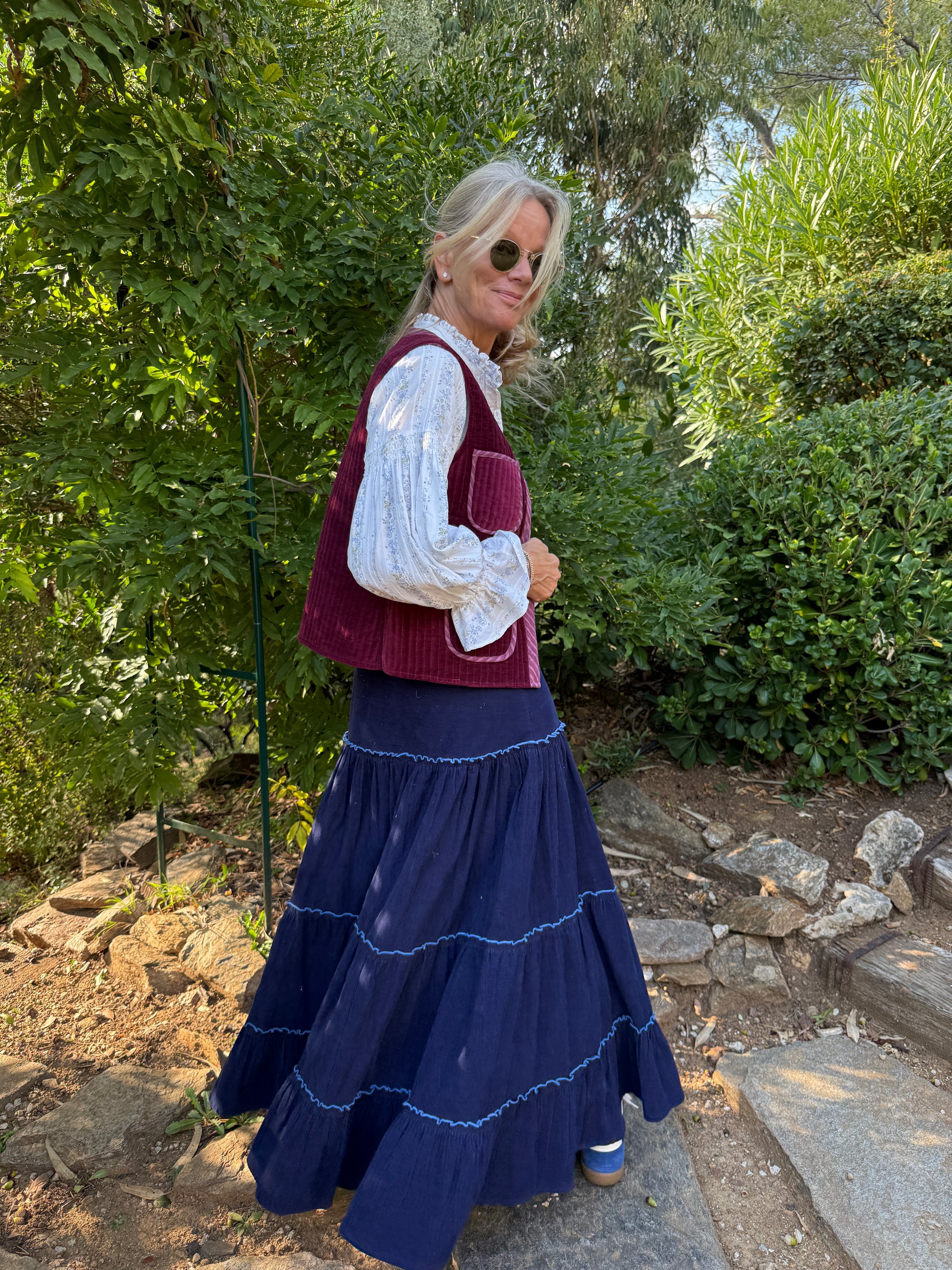 The Tatjana skirt is a wardrobe staple for many and the style sits just below the natural waistline with a side zip and button waist band and is very slimming. We have made it in a beautiful shade of navy blue corduroy and have edged the tiers in pretty cornflower for a pop of colour during the Winter months. This ankle length skirt fits true to size and has a half slip inside. Easily worn with trainers or boots, a jumper on top you are ready for the winter!
