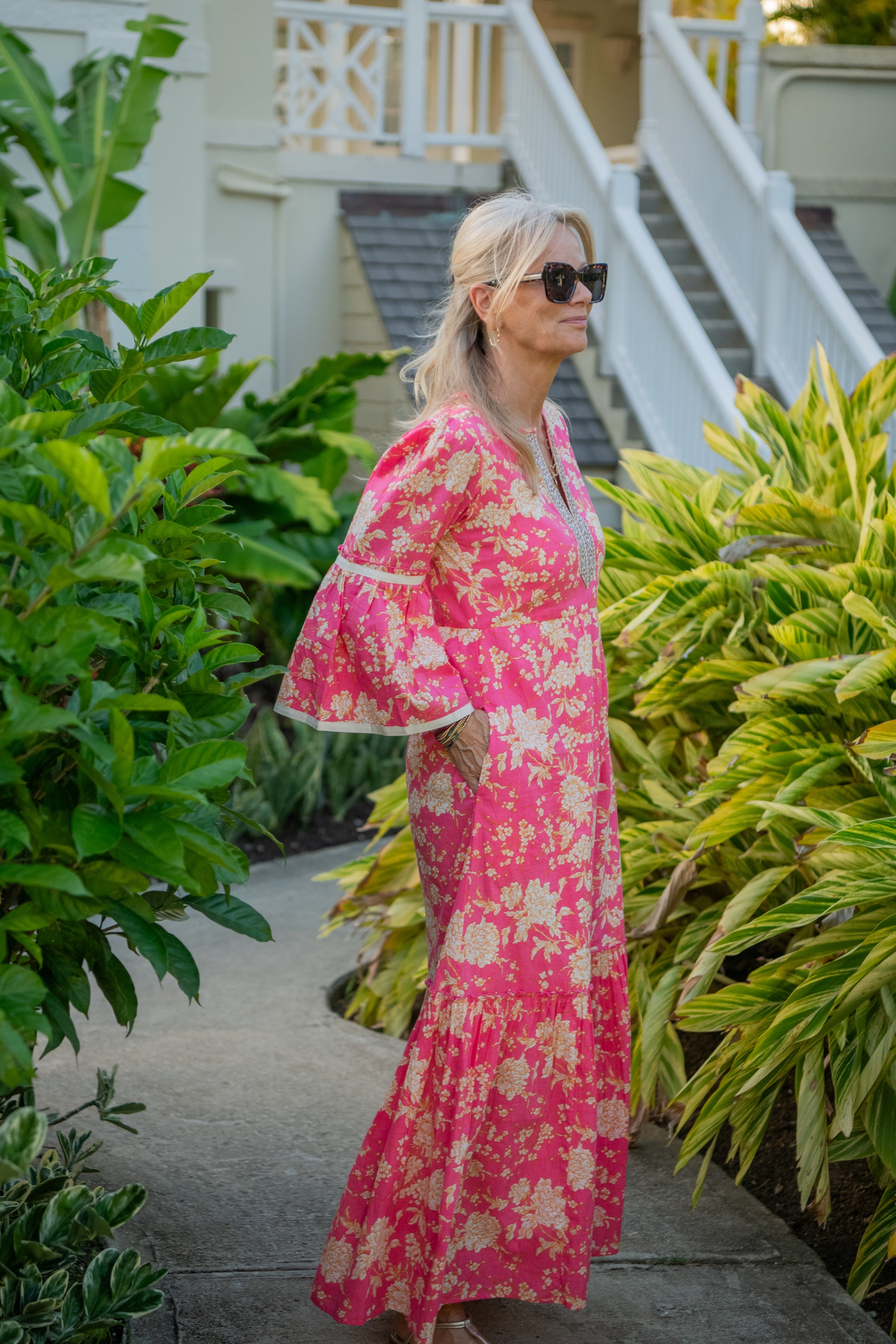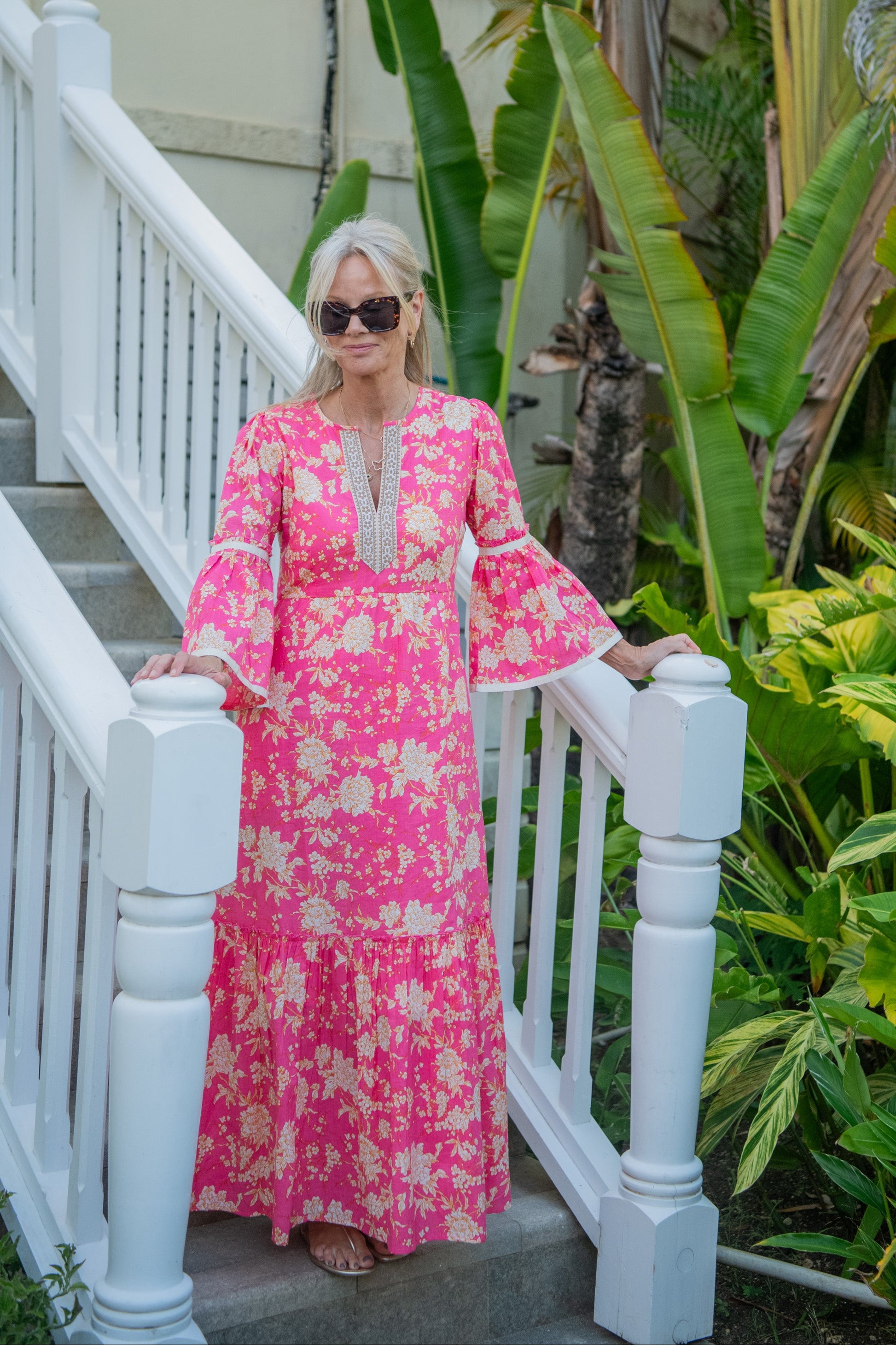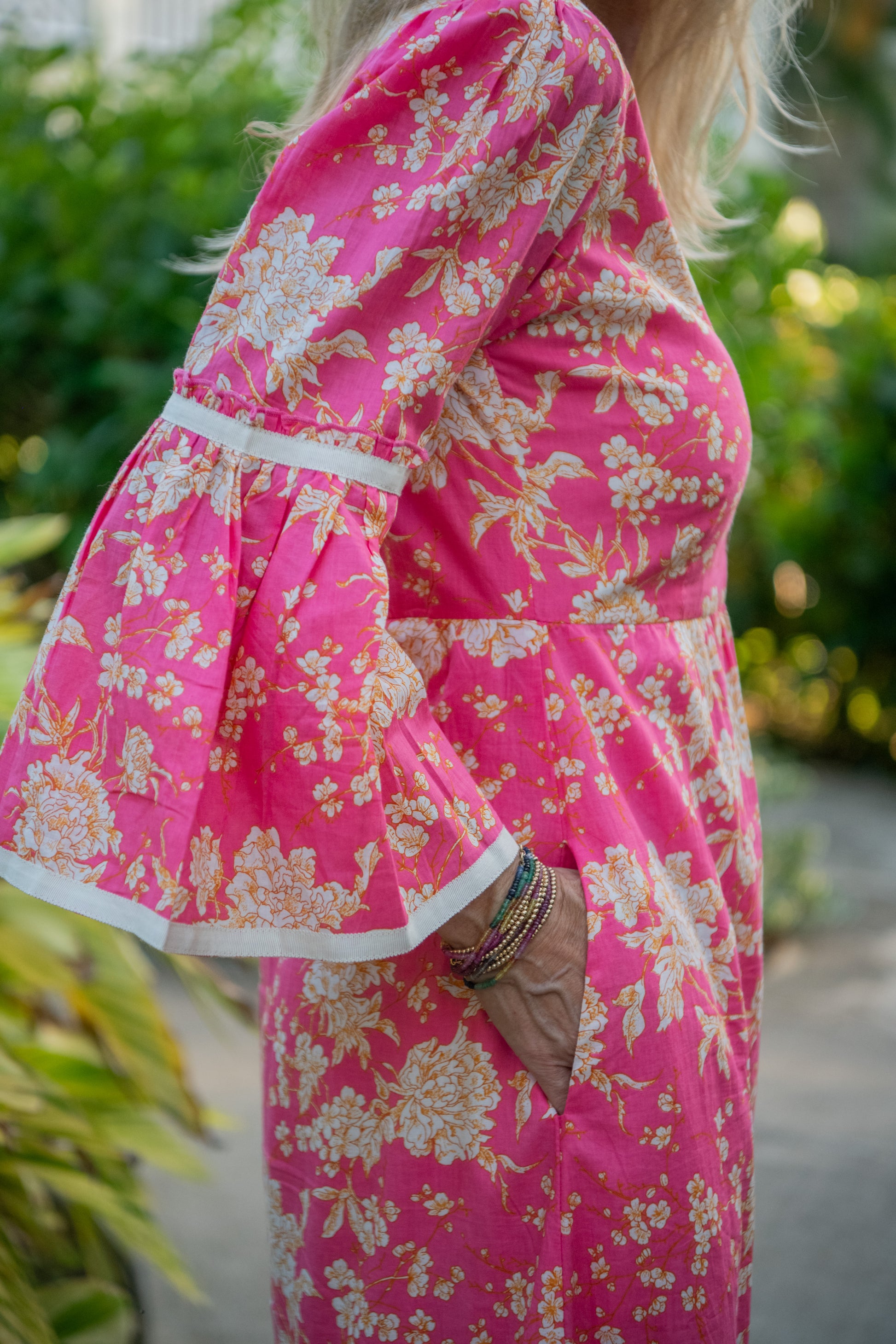 The Texas dress is an old favourite, back and better than ever! Made in a bright pink fabric scattered with delicate white flowers and a hint of burnt yellow detailing, it features a roomy, flattering fit under the bust and gently flares for an effortlessly feminine silhouette. Long sleeves flare from the elbow for a chic, playful shape, while embellished lace trims the neckline, baby overlock finishes the tiers and sleeves, and grosgrain ribbon accents the cuffs. Fully lined and complete with practical pockets, the dress fastens with a discreet side zip. Elegant, versatile, and full of charm, the Texas dress is perfect for day-to-evening wear, from garden parties to weekend brunches, you will definitely stand out!