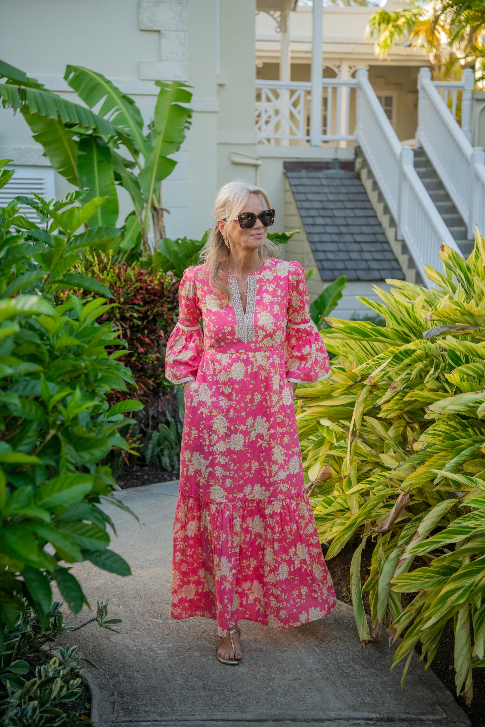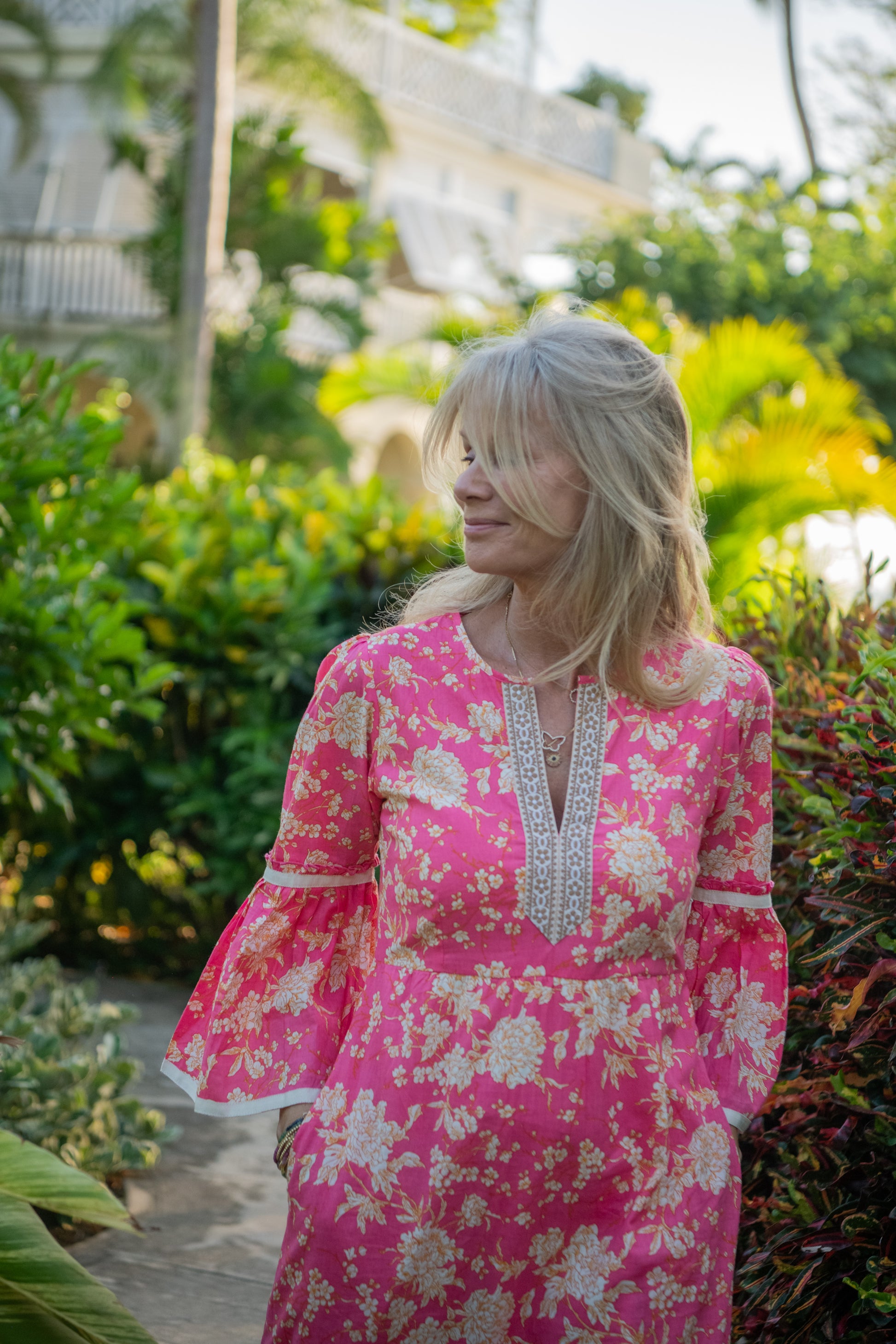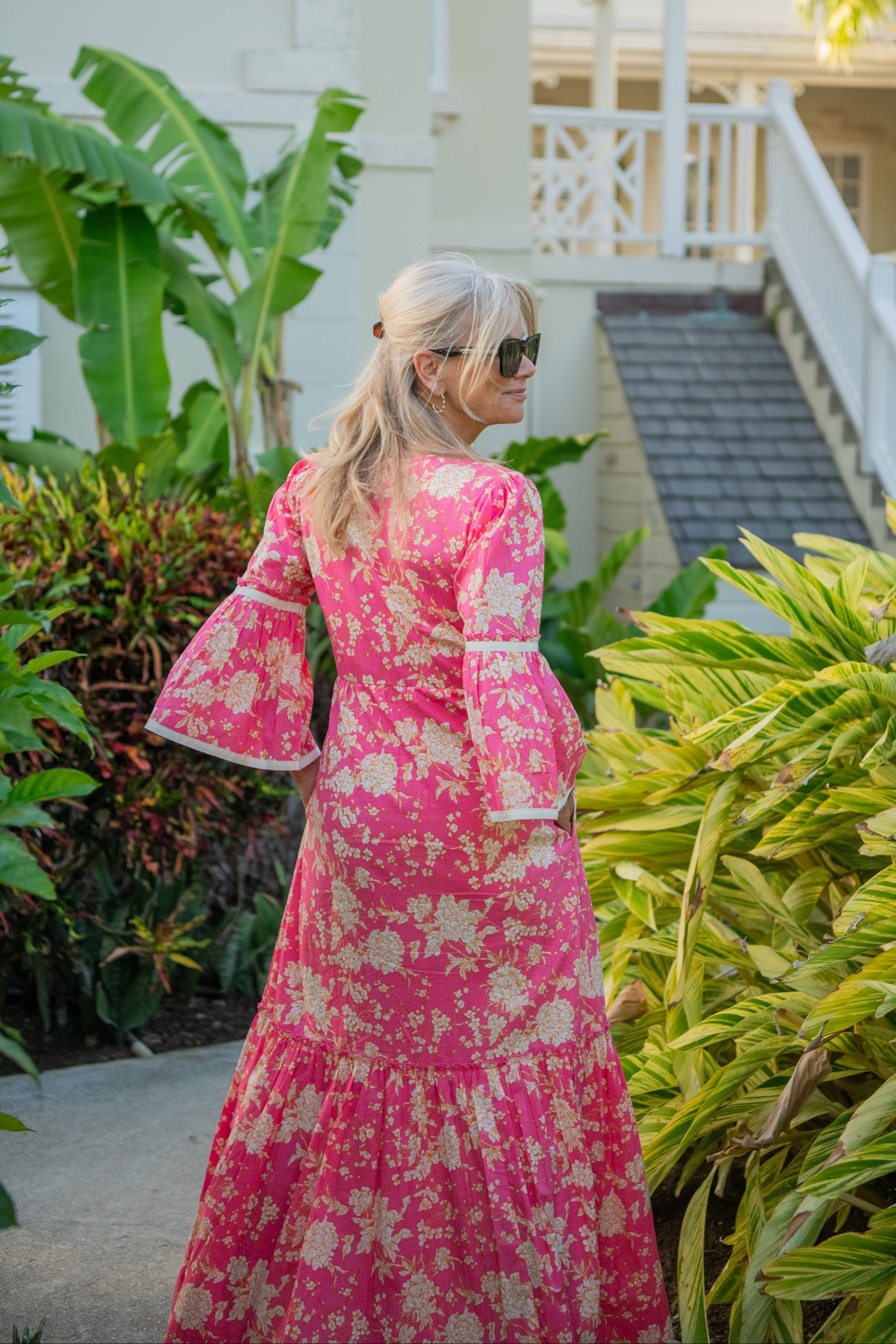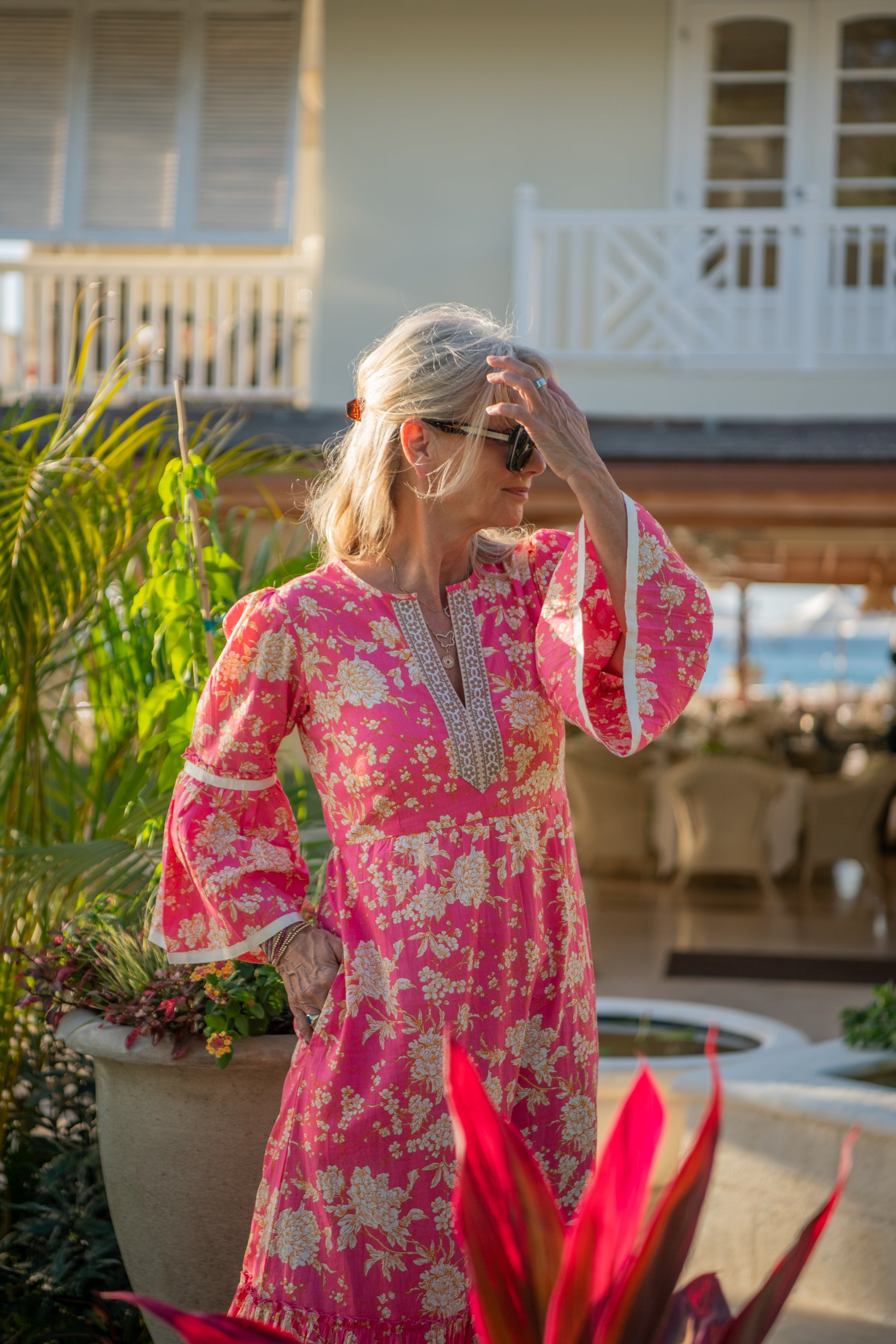 The Texas dress is an old favourite, back and better than ever! Made in a bright pink fabric scattered with delicate white flowers and a hint of burnt yellow detailing, it features a roomy, flattering fit under the bust and gently flares for an effortlessly feminine silhouette. Long sleeves flare from the elbow for a chic, playful shape, while embellished lace trims the neckline, baby overlock finishes the tiers and sleeves, and grosgrain ribbon accents the cuffs. Fully lined and complete with practical pockets, the dress fastens with a discreet side zip. Elegant, versatile, and full of charm, the Texas dress is perfect for day-to-evening wear, from garden parties to weekend brunches, you will definitely stand out!